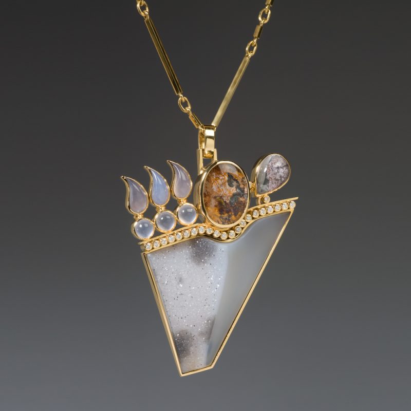 Handcrafted 18ct yellow gold pendant with agate druse, chalcedony, moss quartz, rock crystal with inclusions and diamonds